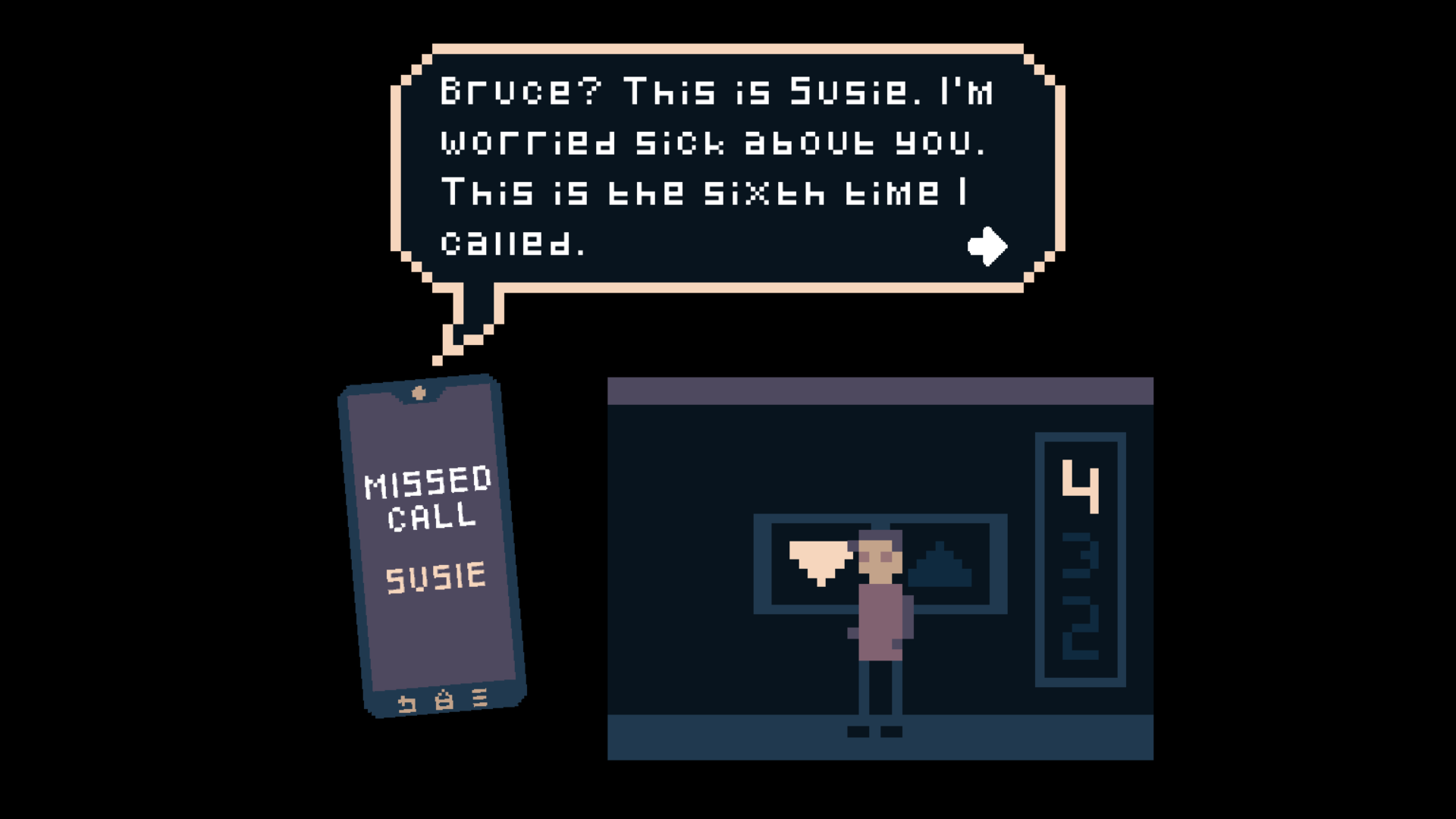 The player controls Bruce, an addict with a troubled past who struggles with his mental health. You get to experience his actions from different POVs as he goes deeper and deeper (this was the theme of the jam) down in a metaphorical elevator.